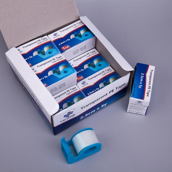 Transparent PE Surgical Tape is a popular choice in the medical field for securing dressings, wound care products, and medical devices. Made from a thin and transparent polyethylene film with a hypoallergenic adhesive backing, this tape is gentle on the skin yet provides strong adhesion to keep the dressing or medical device in place. The transparency of Transparent PE Surgical Tape makes it easy to monitor the wound site without having to remove the tape, allowing for fewer disturbances to the wound and a more efficient healing process. The water-resistant feature of the tape also makes it easy to maintain and clean the wound site, as it can withstand water and other liquids. This type of surgical tape is available in different widths and lengths, making it adaptable to various wound sizes and shapes. It is also easy to tear by hand, which makes it a convenient tool for healthcare professionals to use in various settings. Specification